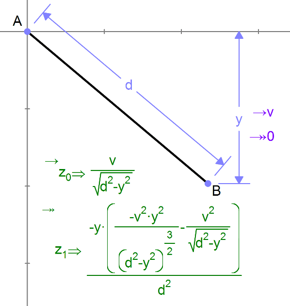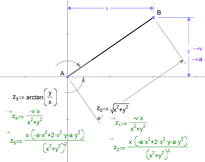 We can also measure the velocity and acceleration of an output measurement (distance or angle). Here we look at a particle B which is moving vertically with velocity v and acceleration a. We measure its distance from the origin and the angle it makes with the x axis. To measure the apparent velocity and acceleration to an observer at A, we measure the velocity and acceleration of the distance.